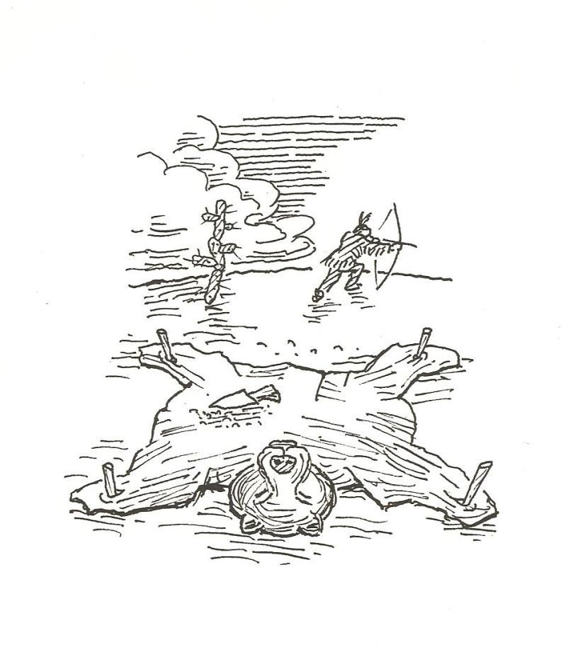 On approaching the camp he passed a group of teepees belonging to a family whose father was sick. He decided he would leave the deer with them. Gratefully they accepted. Back in his own part of the camp there lay the bear skin and the blunt tools. He sighed and picked up his work. His mind was not on it as he scraped away at the remains of the fat clinging to the hide. Shortly afterwards his mother returned.